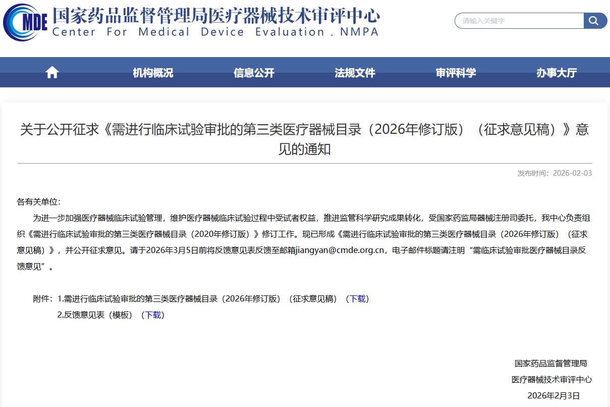 需进行临床试验审批的第三类医疗器械目录(2026年修订版)(征求意见稿)发布!