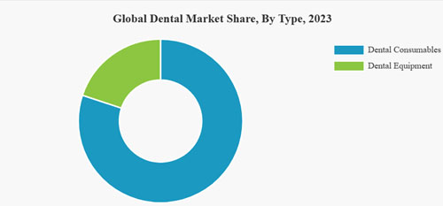 在2023年,牙科消耗品板块占据了市场的最大份额,并预计在预测期内将以最快的速度持续增长。这一细分市场的主导地位主要得益于错颌畸形发生率的上升以及对隐形正畸,尤其是青少年和女性群体中日益增长的需求。隐形矫正器的广泛应用促使主要企业不断推出创新产品,增加了市场供应与可及性,进一步推动了市场增长。此外,随着缺牙和龋齿情况的增加,以及对传统牙套矫正错位牙齿需求的增长,加之人们对美观外表的重视,这些因素共同促进了牙科修复产品需求的高涨,进一步加速了该板块的增长。例如,2022年2月,Bausch Health Companies Inc.旗下的口腔健康业务部门OraPharma宣布在美国推出OraFit定制型隐形矫正系统,用于纠正错颌畸形。