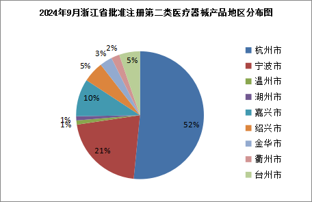 按照注册申请人所在辖区分析,批准注册的95个医疗器械产品中,杭州市49个,宁波市20个,温州市1个,湖州市1个,嘉兴市9个,绍兴市5个,金华市3个,衢州市2个,台州市5个。