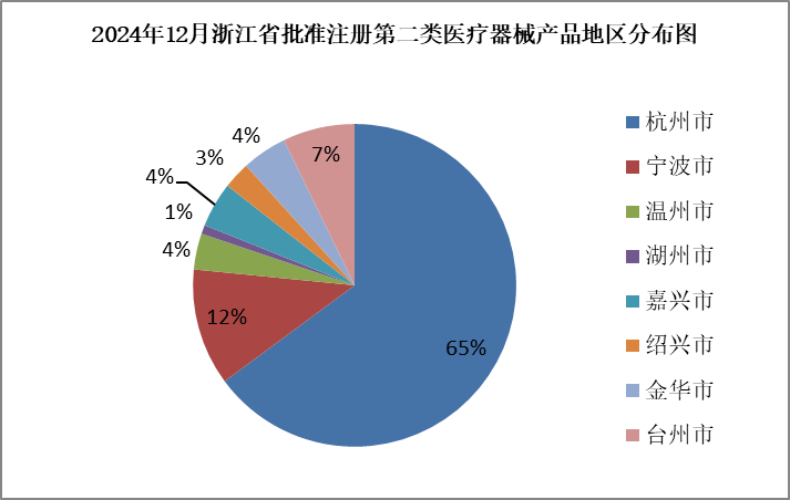 按照注册申请人所在辖区分析,批准注册的111个医疗器械产品中,杭州市72个,宁波市13个,温州市4个,湖州市1个,嘉兴市5个,绍兴市3个,金华市5个,台州市8个。