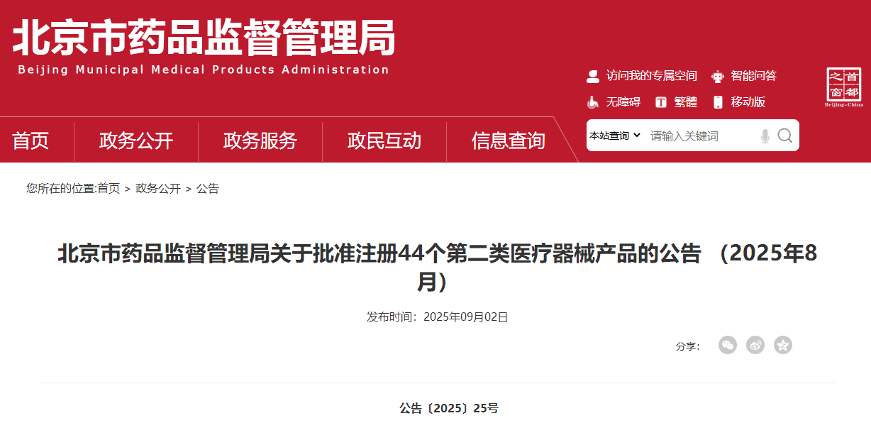 北京市25年8月共批准注册第二类医疗器械产品44个(附名单)