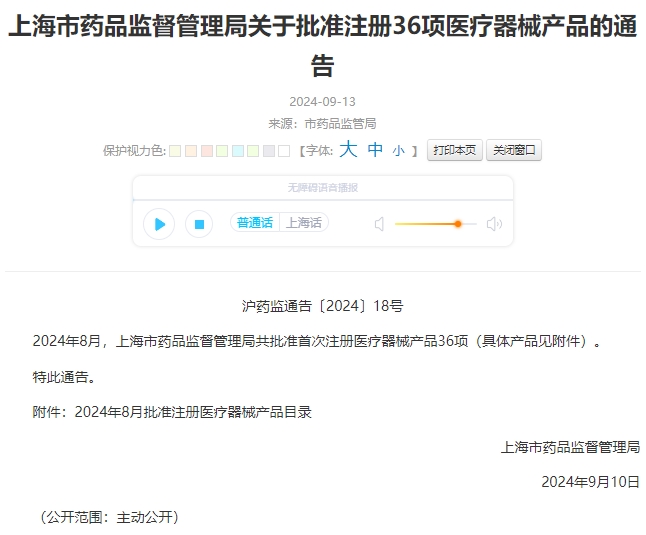 上海市2024年8月批准注册36个第二类医疗器械产品(附名单)