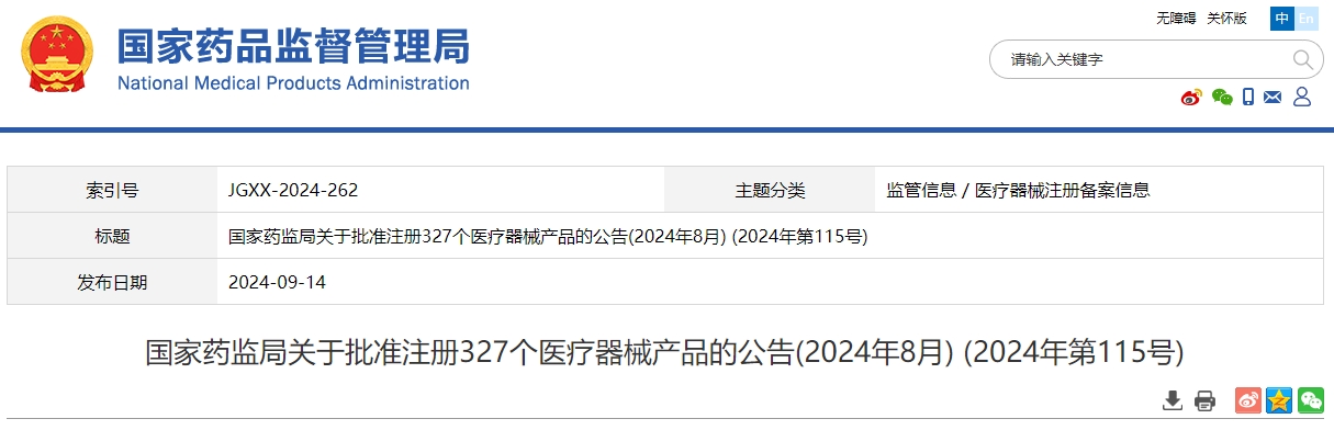 国家药监局批准注册327个医疗器械产品的公告(2024年8月) (2024年第115号)
