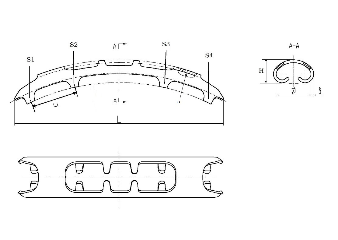2.2提供产品各型号关键部位的结构图。在图示中标识关键尺寸信息及测量位置,例如记忆合金肋骨接骨板长度(L)、高度(H)、厚度(δ)、环抱臂内径(Φ)、环抱臂分布(环抱臂间距L1和数量S1-S4等)、弧度(α)、宽度(W)、镂空部位尺寸(如适用)等。明确产品各型号的关键尺寸及公差。注册申请人可结合申报产品特点选择关键尺寸参数进行规定以充分表征产品结构设计特征。