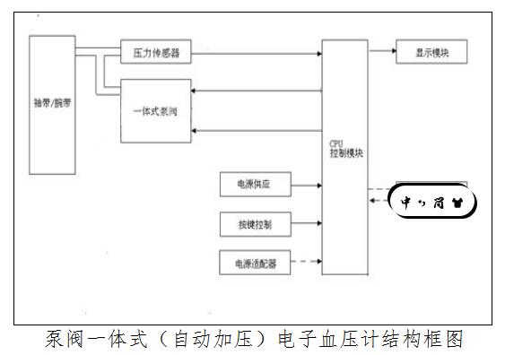 电子血压计的主机结构通常包括气泵(或橡胶球)、压力传感器、放气阀、电源供应电路、按键控制电路、显示模块、CPU控制模块、嵌入式软件等。产品的关键部件为:压力传感器、袖带或腕带、嵌入式软件(用于血压监测过程控制、信号特征提取以及血压的计算)。