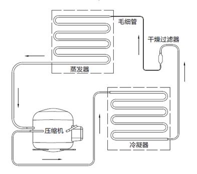 蒸汽压缩式制冷是指液态制冷剂在蒸发器中汽化变成气态制冷剂进入压缩机,被压缩成高温高压的气体,然后排放到冷凝器中,在冷凝器的作用下,气态制冷剂被冷却成高压的液体,然后进入节流装置(常见的有毛细管和膨胀阀),被节流的液态制冷剂的压力和温度再次降低,液态制冷剂进入蒸发器后,会再次汽化吸热,周而复始达到制冷效果。